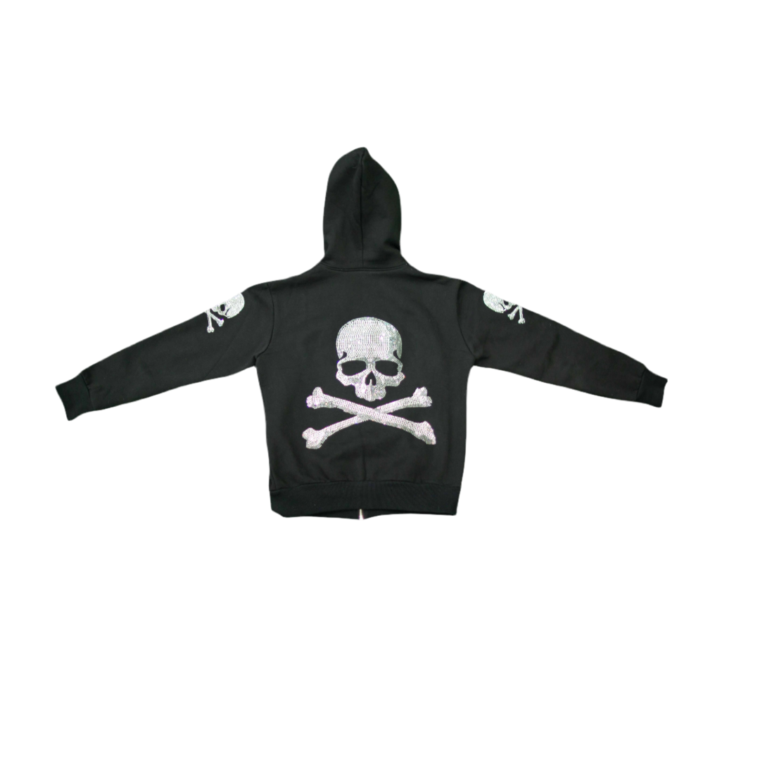 Premium quality Black zip up hoodie with skull and bones logo in clear rhinestone